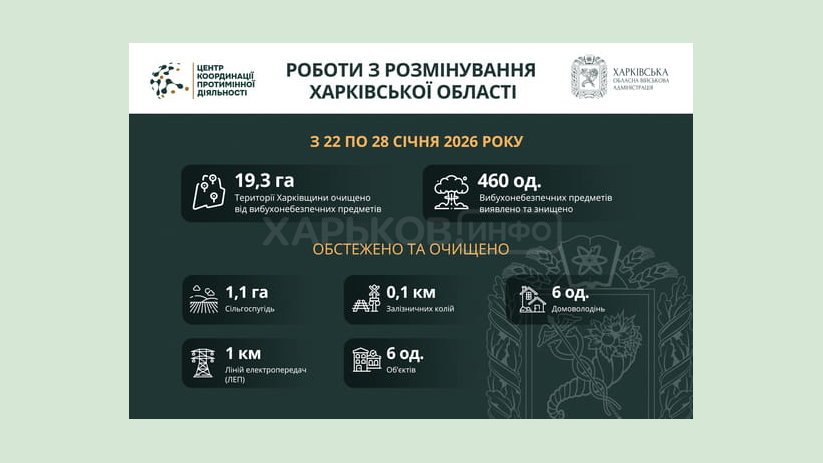 З 22 по 28 січня включно піротехнічні підрозділи в Харківській області розмінували понад 19 га території, виявили та знешкодили 460 вибухонебезпечних предметів.