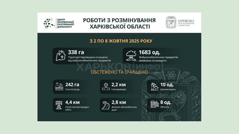 З 2 по 8 жовтня включно піротехнічні підрозділи в Харківській області розмінували понад 338 га територій, виявили та знешкодили 1683 вибухонебезпечні предмети.