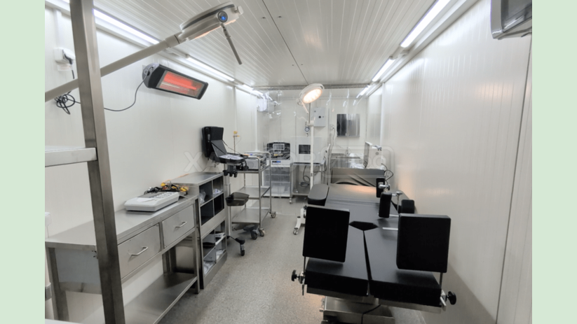 На базі модуля встановлено операційний стіл і широкий набір життєзабезпечувального та діагностичного обладнання: апарат штучної вентиляції легень, медичний кисневий концентратор, два портативні хірургічні аспіратори, дефібрилятор із модулем кардіостимуляції, дві інфузійні помпи з підігрівачем, активна термоковдра, монітор пацієнта, хірургічний коагулятор, апарат УЗД з платформою для загальних досліджень, бактерицидний опромінювач, два операційні світильники, холодильник для зберігання лікарських засобів, реагентів та вакцин, медичний штатив для інфузій, електрокардіограф та паровий стерилізатор з водяним охолодженням.