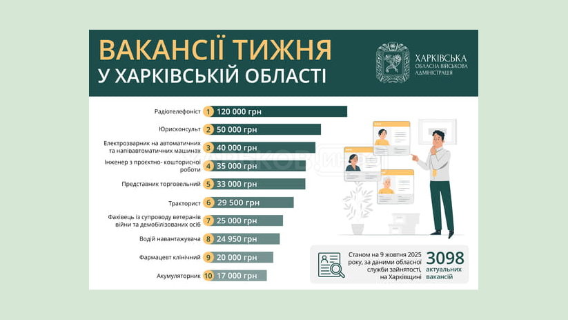 Станом на 09 жовтня 2025 року, за даними обласної служби зайнятості, на Харківщині актуальні 3 098 вакансій.